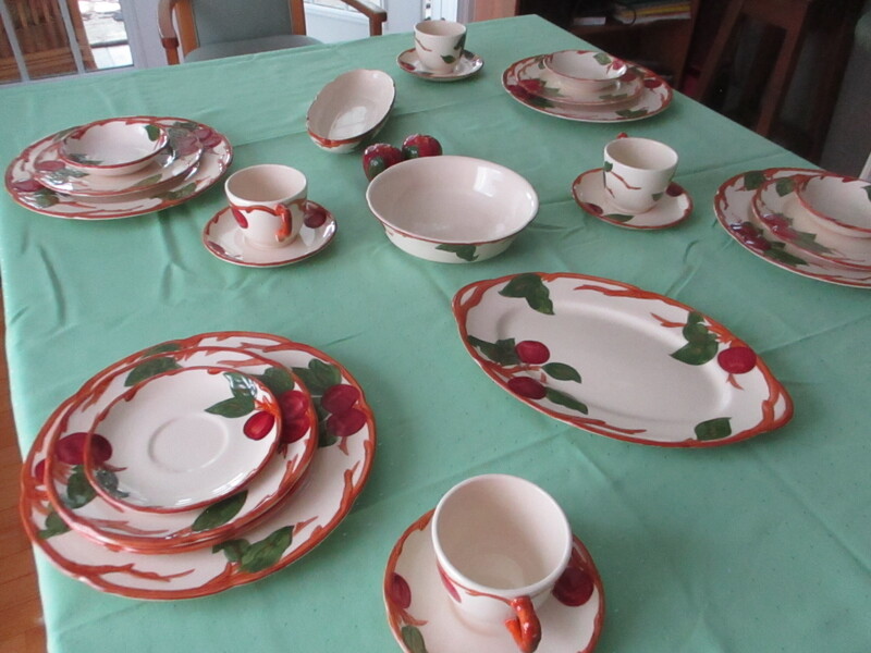 Set de vaisselle de 26 morceaux: 4 couverts de 5 morceaux plus 6 mrcedaux de service. De marque Franciscan Apple fabriqué en Californie au début des années 50. En faience ( céramique) en parfaite condition