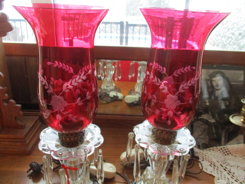 2 lampes en verre avec larmes en verre également. Le globe est de couleur Ruby Glass avec des feuilles et des fleurs argentées. 15 po de hauteur