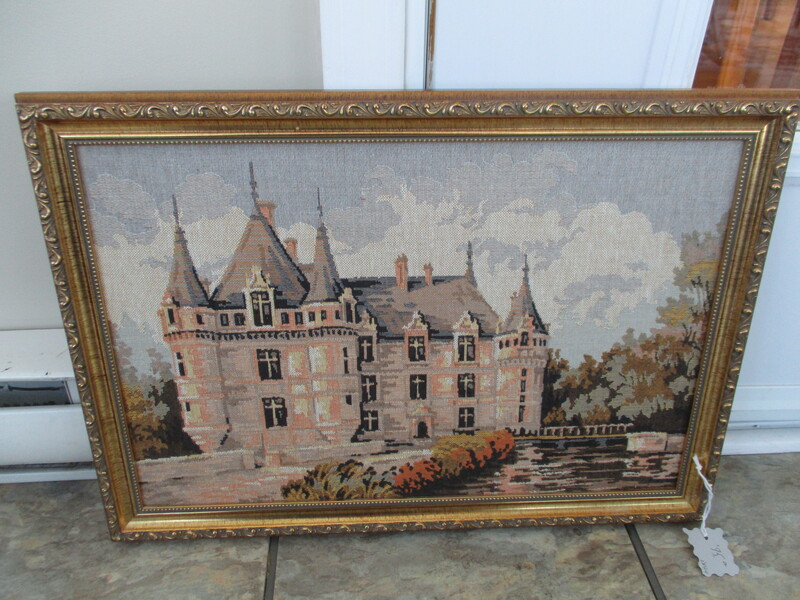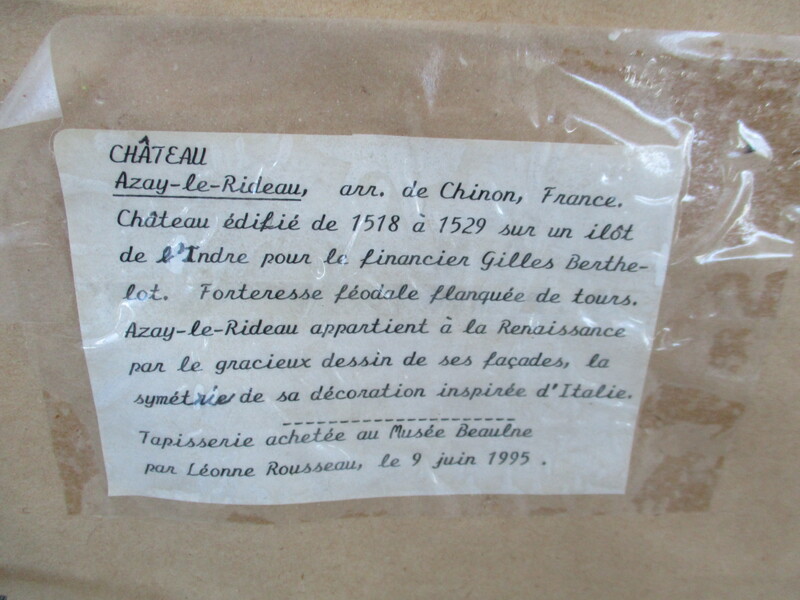 Tapisserie représentant le Chateau d'Azay-le-rideau de France. La propriétaire l'avait acheté du musée Baulne de Coaticook. 20 X 14 po de hauteur