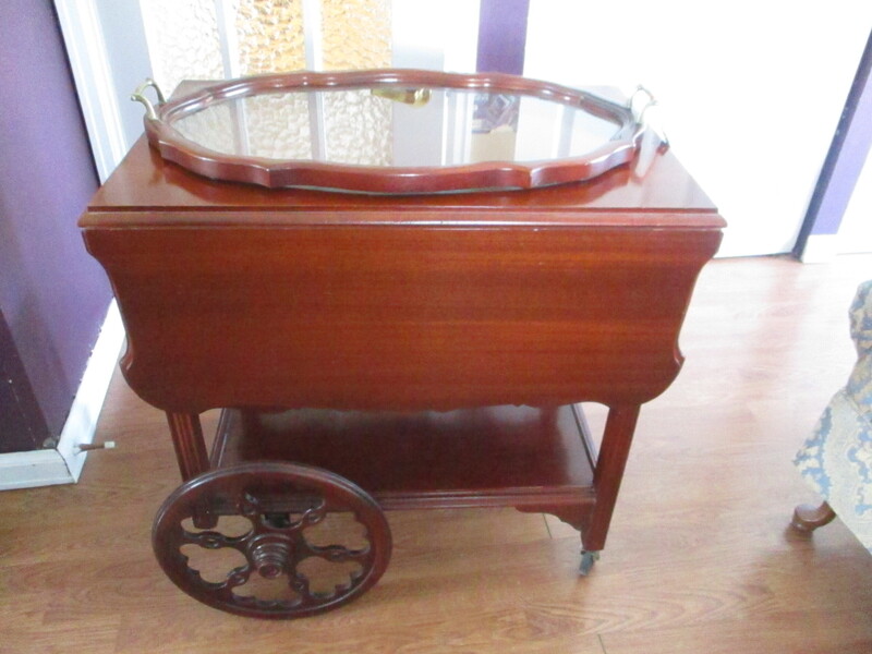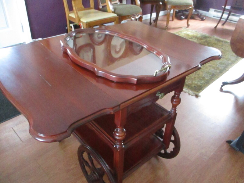 Chariot desserte en érable avec plateau de service. Roues en bois, un tiroir et une poignée de transport. Années 60. 2 panneaux se soulèvent, en très bon état. 28 X 18 X 28 po de hauteur