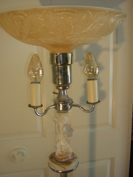 Lampe en métal avec décorations en onynx. Abat-jour en verre beige.