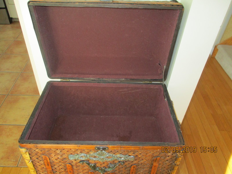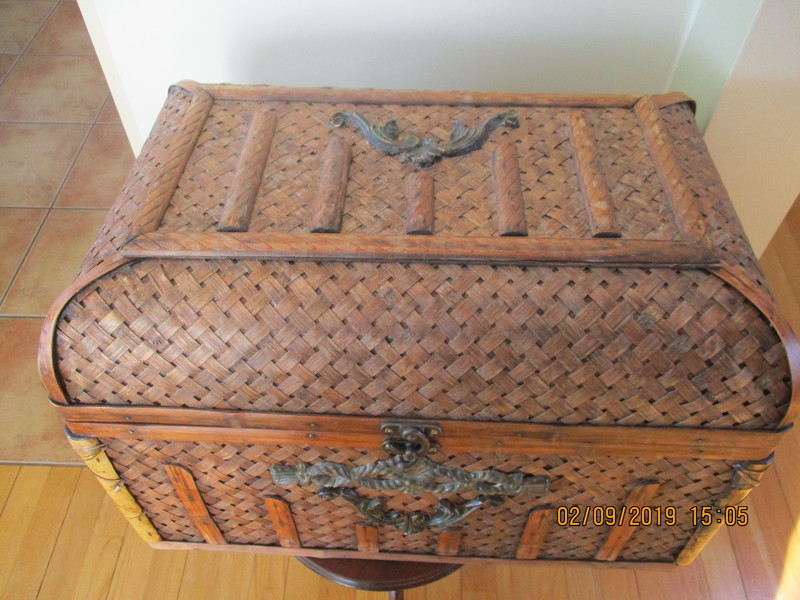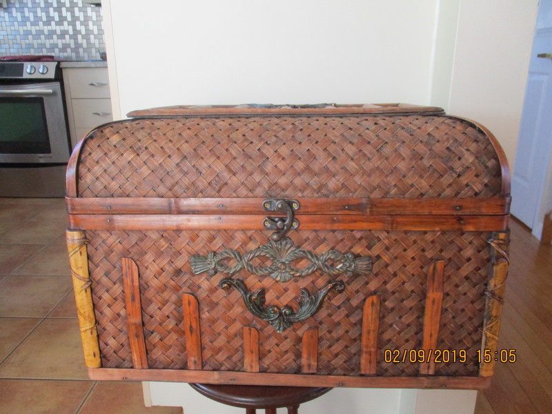 Peetit panier en jonc et bois avec couvercle. Très bon état. Appliqués décoratifs sur le devant et le dessus. 19" X 12½" X 12½ de haut