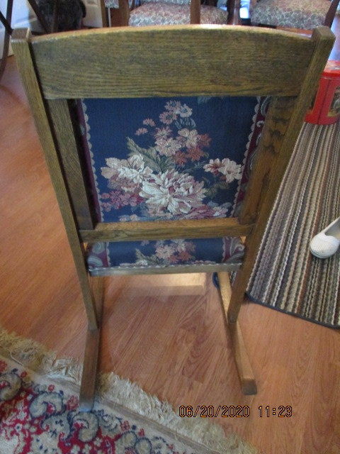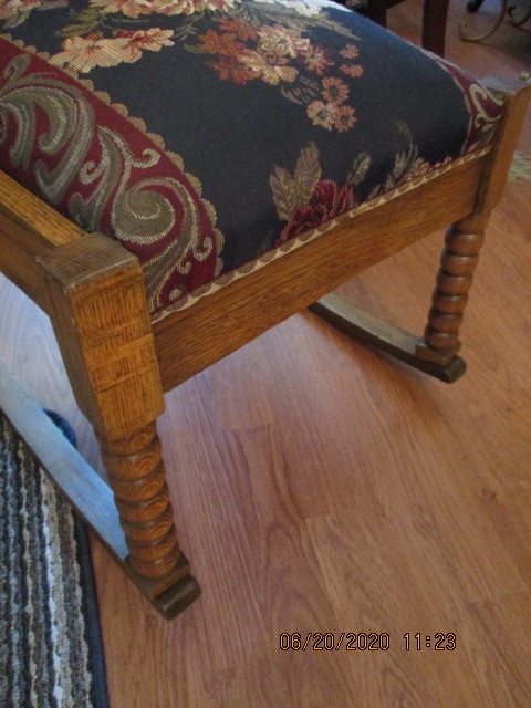 Petite bercante en chêne. Vers 1910. 2 pattes tournées à l'avant , le rembourrage et le recouvrement refait. Tissus a base de bleu marine et bourgogne. 18" X 28"X 33 h