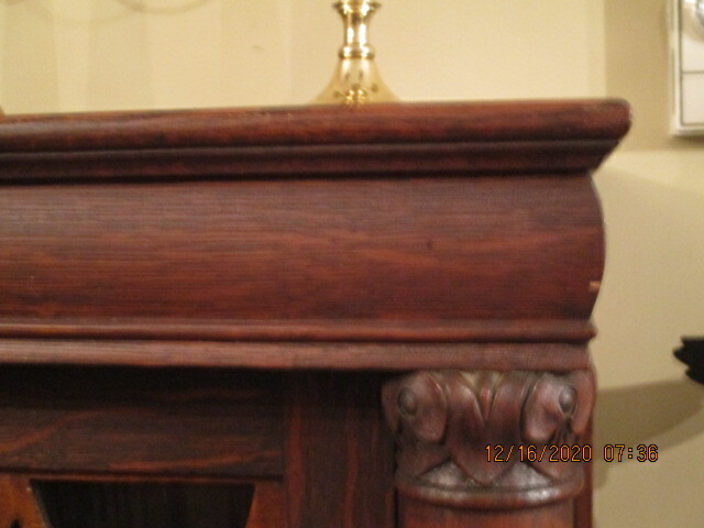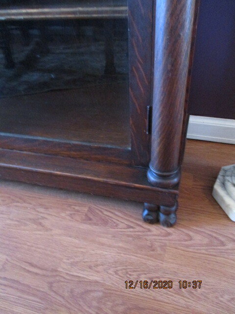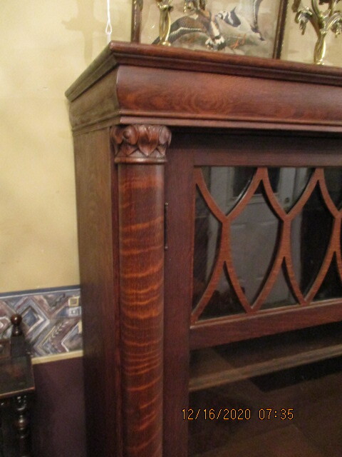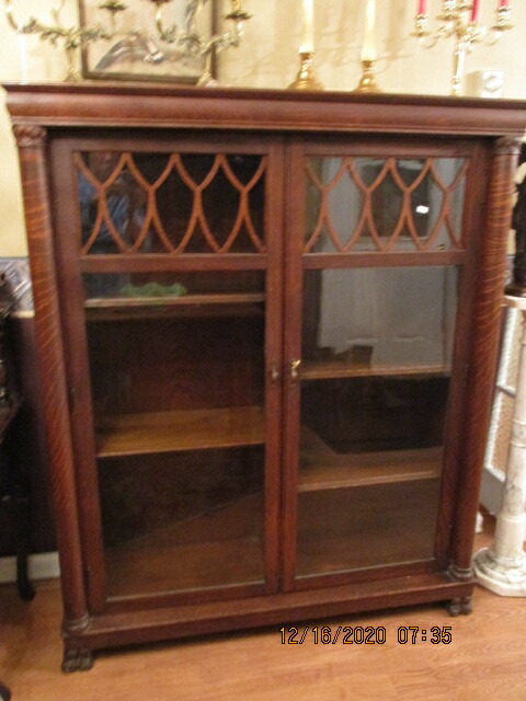 Bibliothèque 2 portes en chêne maillé, sur son fini d'origine. Pattes de lion, colonnes, haut de porte avec appliqués en chêne. Haut de colonne sculpté. 5 tablettes ajustables. Bonne condition d'origine. Fabriquée par Larkin, Buffalo N.Y. Début XXe. Longueur: 49" profondeur: 14¾" 58½"