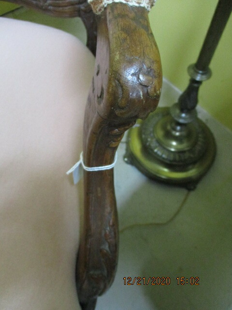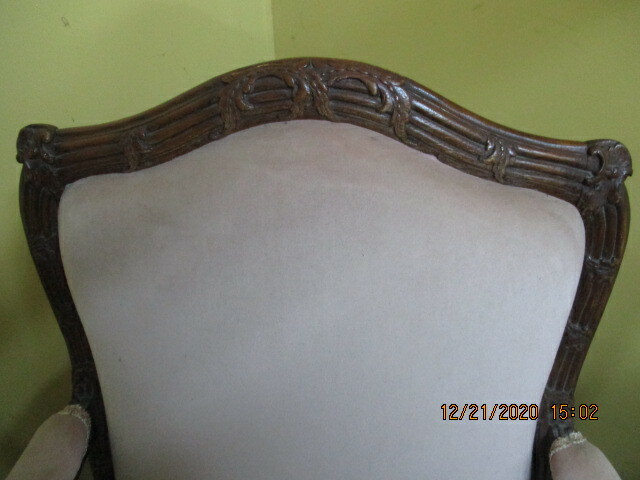 Fauteuil de style Louis XV avec sculptures, tant au dossier, qu'aux bras et au piètement. Vers 1900. Tissus vieux rose. En bonne condition. 28" X 29" X 39"H