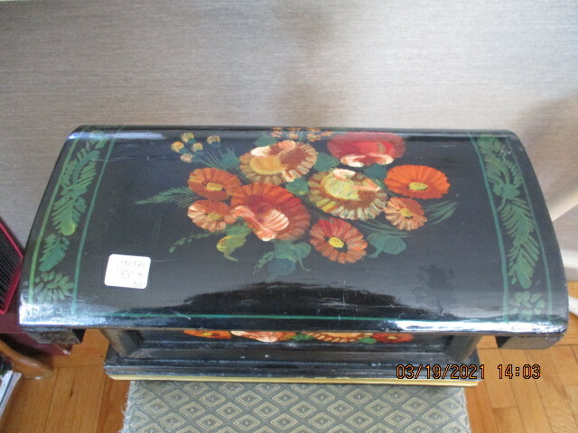 Joli coffre a documents en bois avec petit compartiment intérieur. Noir a bordure or avec fleurs multicolores peintes a la main. 13" de longueur 7" de largeur et 7" de hauteur