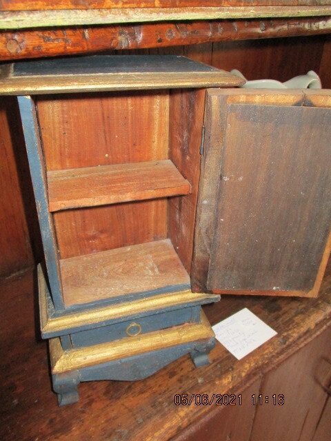 Coffre à bijoux en bois en forme d'armoire. Une porte, un tiroir et un miroir. De couleur bleu et or. 7½" X 14"H X 5"