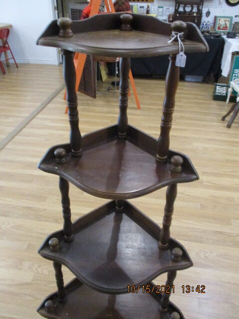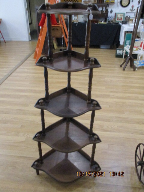 Étagère de coin foncée à 5 tablettes. En bon état. 24" de large par 17" de profondeur et 53" de hauteur