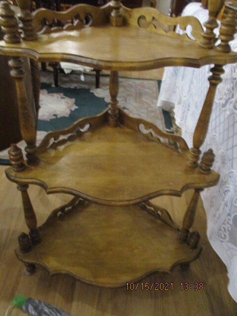 Étagère de coin pâle a 5 tablettes. En bon état. 25" de large par 18" de profondeur et 58" de hauteur