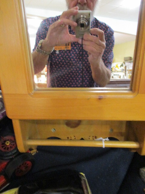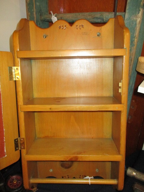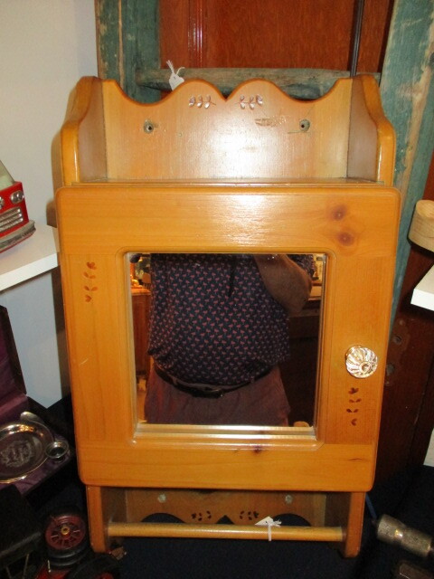 Petite pharmacie ancienne avec miroir et barre à serviette. Intérieur 2 étages. Décorée de feuillage gravé. 13" x 6½" x 25"h