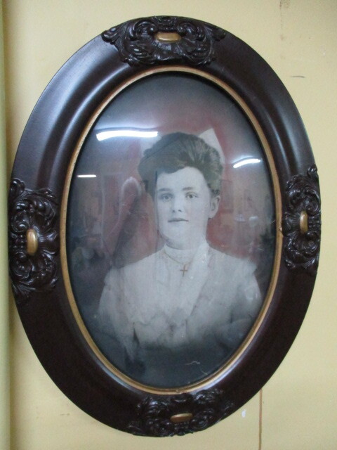 Cadre à vitre bombé avec 4 appliqués décoratifs sur le cadre. La photo a été retouché à la main à l'époque ( fin du X1X e siècle) 18½" X 24" H