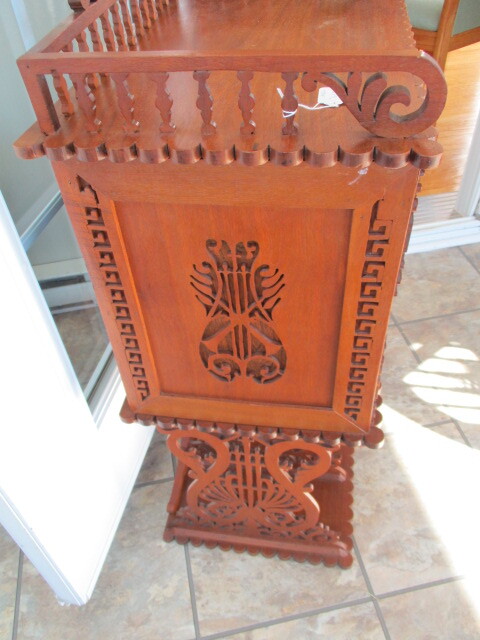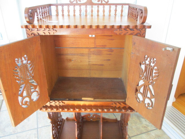 Très original meuble à disques ou à boisson, centenaire avec 2 portes de rangement et 3 compartiments au bas. Belles sculptures aux portes et sur les côtés. Jolie galerie sur le dessus. 19½" x 14" x 36"h