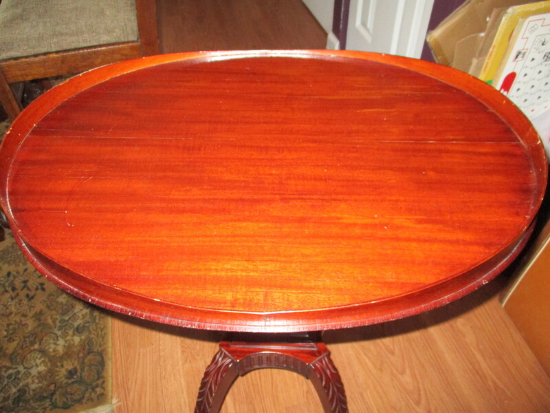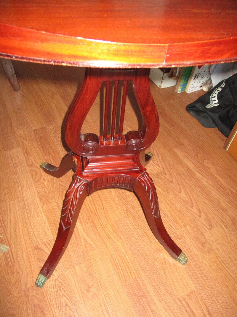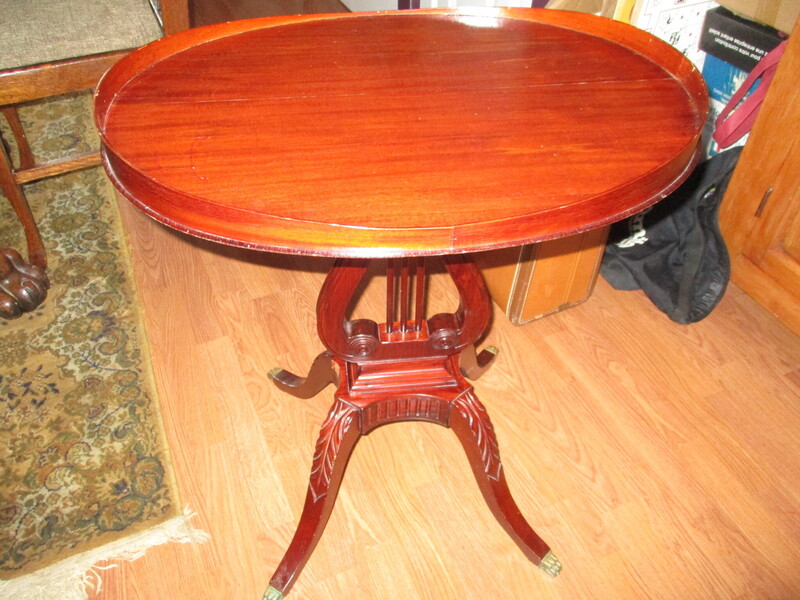 Très original table d' appoint de style Duncan Phyphe avec harpe en son centre. Plateau ovale avec rebord, le tout en acajou. Tres bon état. 24 X 17 1/2 x 28 po de hauteur
