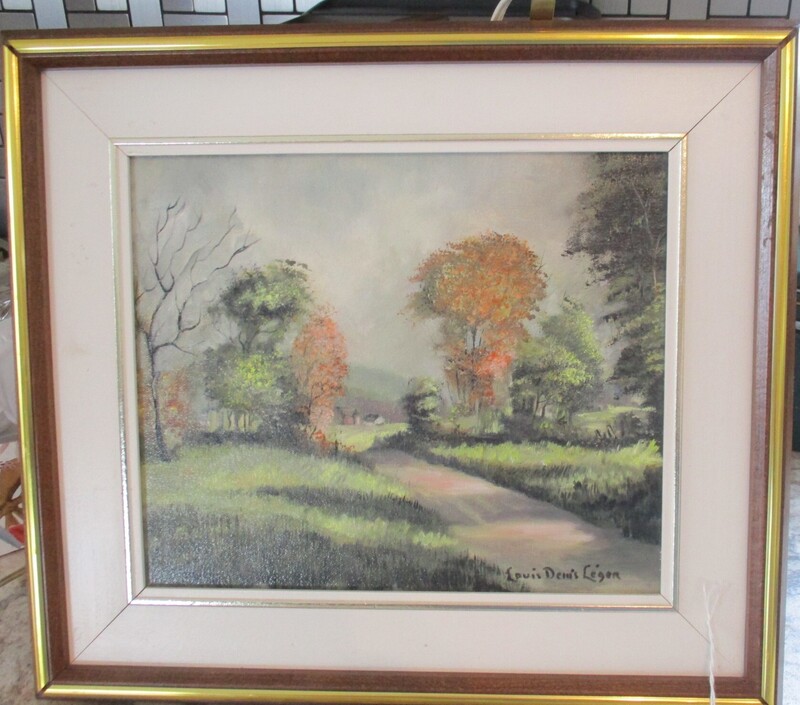 Toile du peintre Louis-Denis Léger de St-Jean-Port-Joli intitulé L'automne de 1986. 14po1/2 X 16po1/2. Lampe d"éclairage au dessus