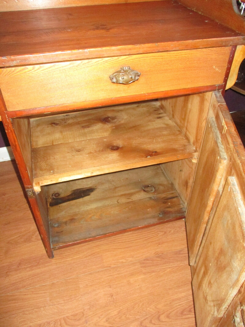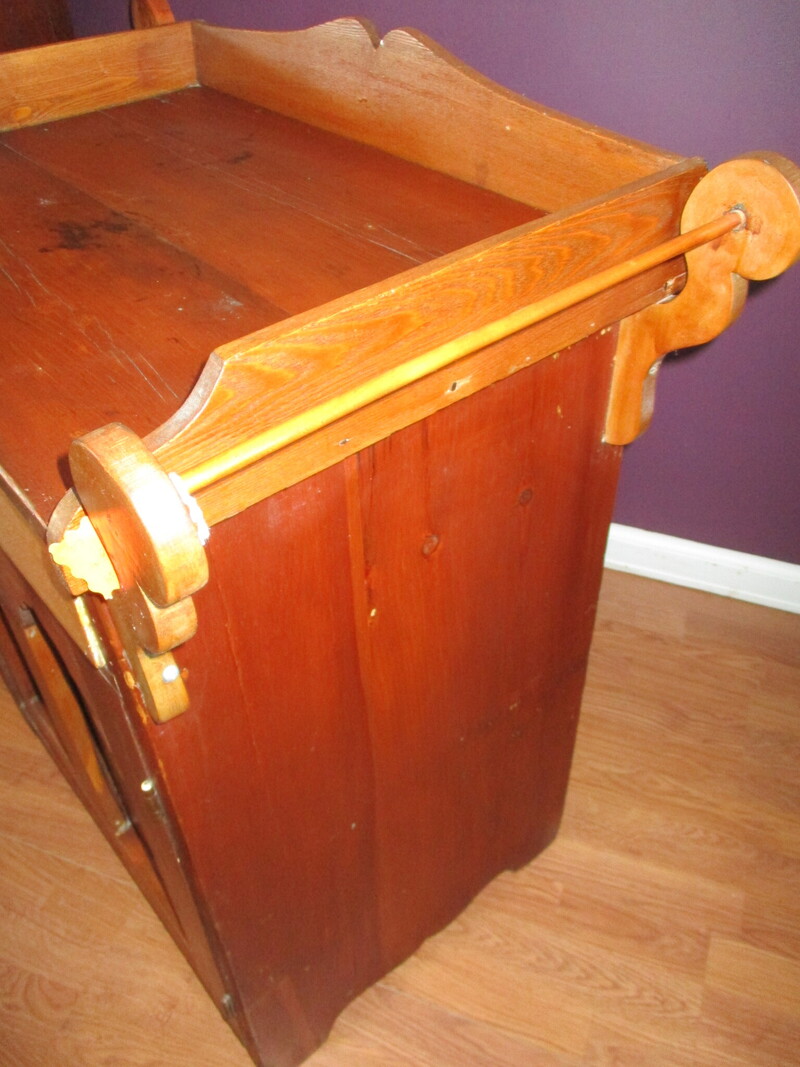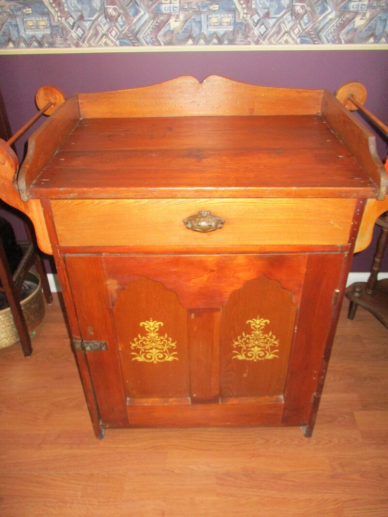 Chiffonnier a clous carrés avec 2 barres a serviettes. Vers 1880. Un tiroir et une porte. Tablette intérieure. Stencils dans la porte. 33 x 18 x 34 po de hauteur.