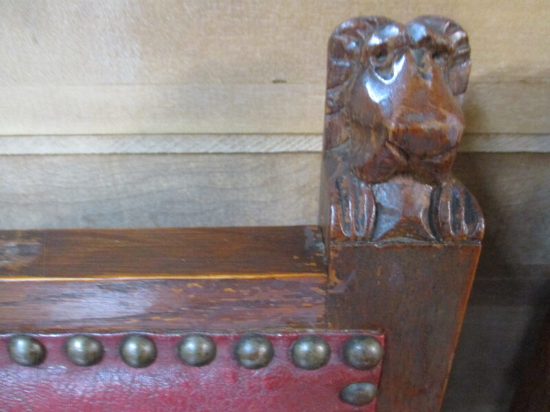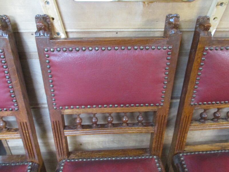 4 chaises médiévales en bois et cuir aux sièges et dossiers, 2 sculptures de têtes de lion a chaque dossier. 2 chaises supplémentaires mais qui doivent etre réparées