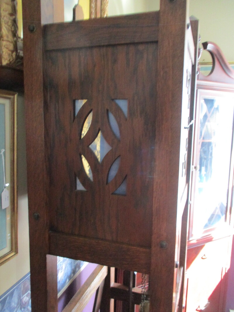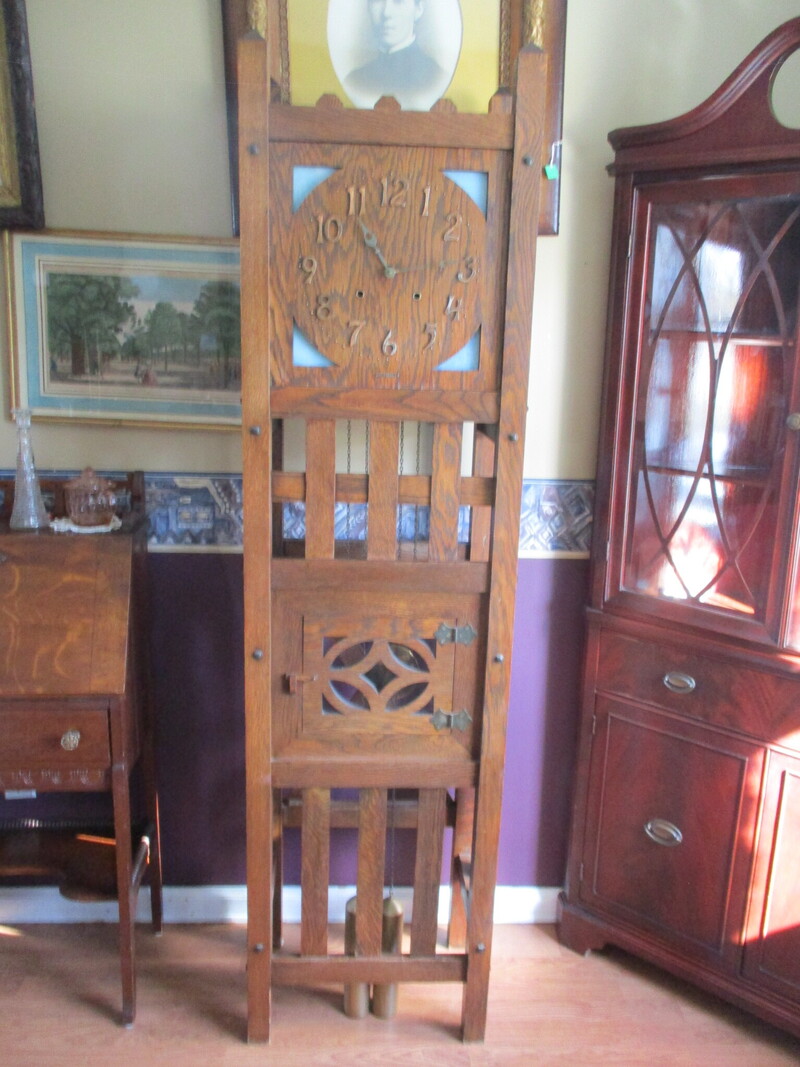 Horloge grand-père en chêne de style Mission. Vers 1900. Signé Sessions. Mécanisme avec 2 poids. On la remonte èa la semaine. Fonctionne très bien. 181/2 po X 121/2 X 71 po de hauteur