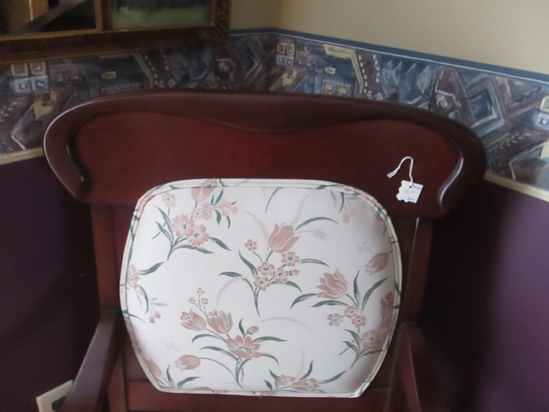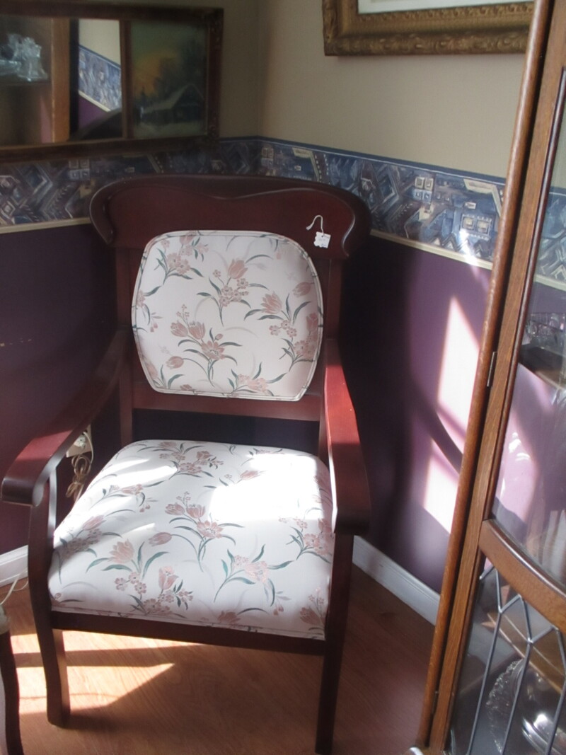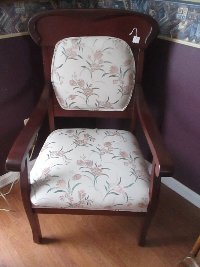 Fauteuil a bras de style Victorien avec recouvrement beige et fleurs vieux rose et vertes. 24 X 19 X 39 po de hauteur