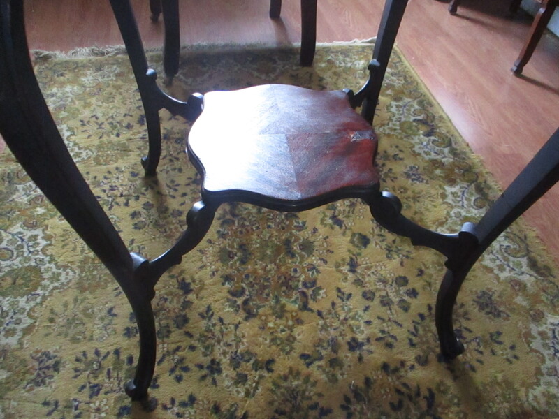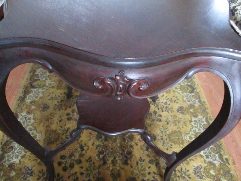 Table de salon Victorienne en acajou avec pattes galbées et tablette au bas. Sculptures sur les côtés. Vers 1890. 22 po 1/2 carré