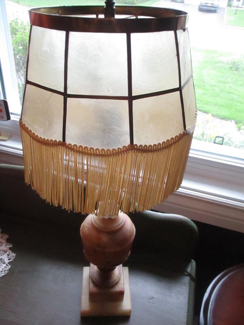 Lampe a base en marbre brun avec abat-jour. 9 po de diamètre par 2 po de hauteur