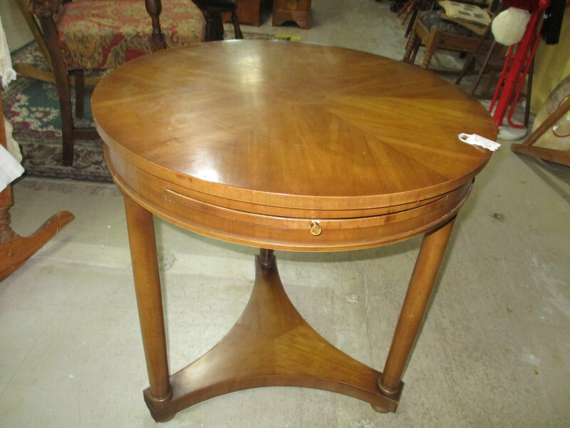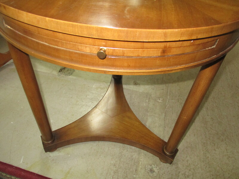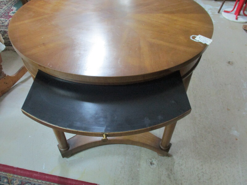 Table ronde d'appoint en noyer avec tablette intégrée. 25 po de diamètre par 26po 1/2