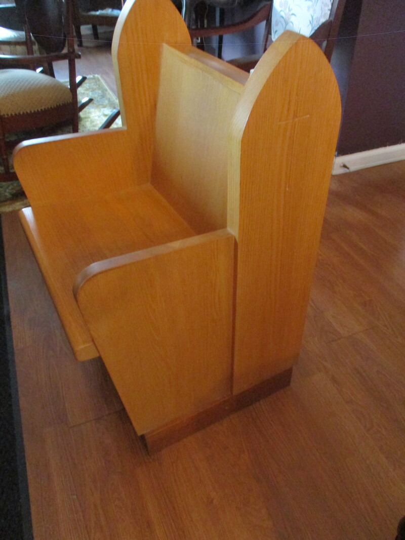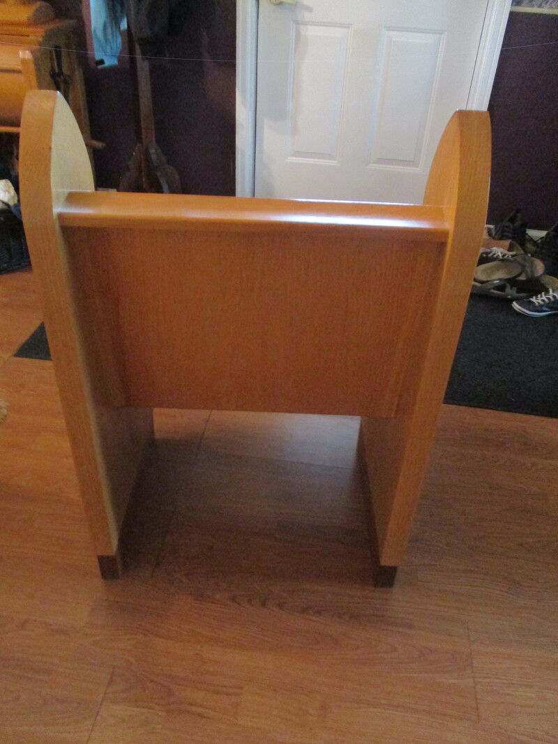 Petit banc dMéglise servant de banc a l'officiant de la messe. En chêne avec croix ciselée de chaque côté. Provient de l'église de St-Denis de Brompton. 23 X 21 X 36 po de hauteur
