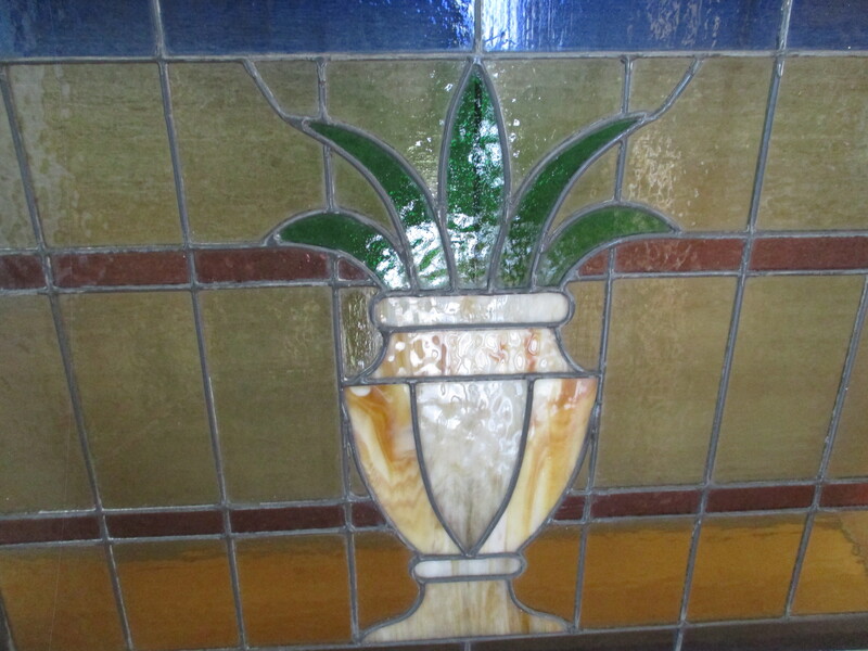 Magnifique vitrail avec pot a fleurs. Couleurs: bleu, bourgogne, vert et ombre 34.5 x 25 po de hauteur