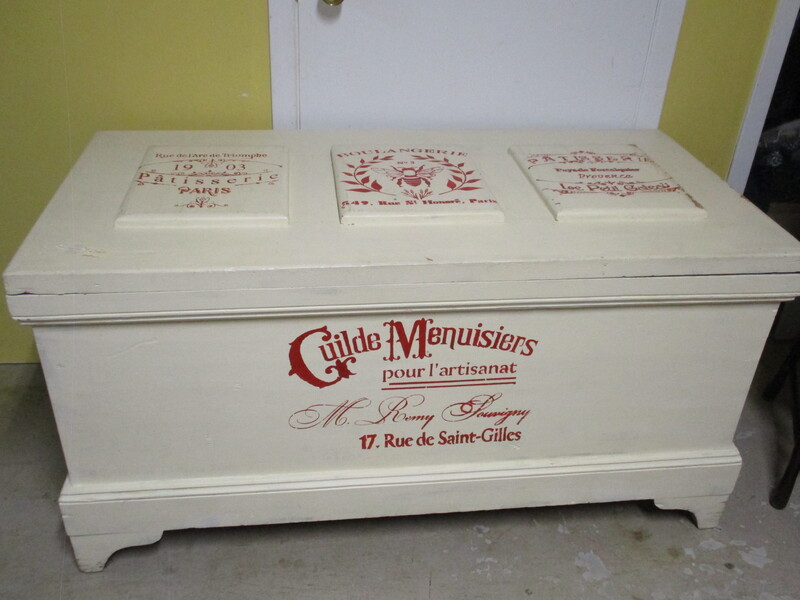 Grand coffre en pin de couleur crême décoré sur pochoir avec des adresses de Paris. 49 X 25 X 25 po de hauteur