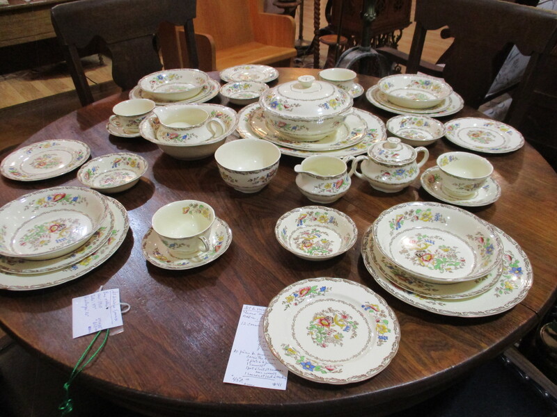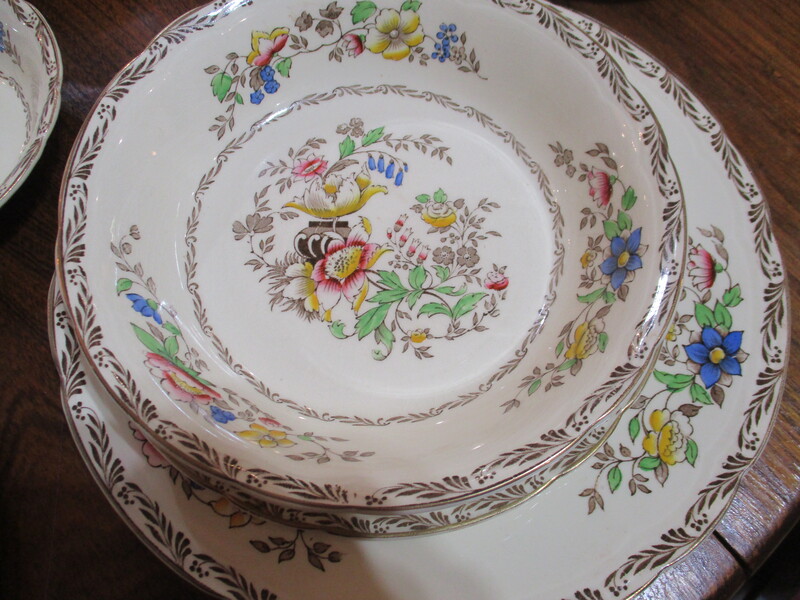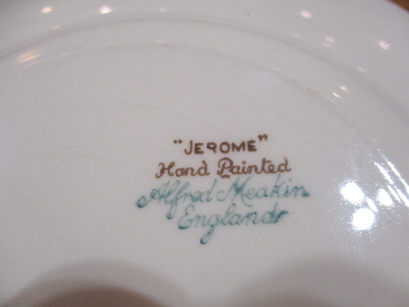 Très beau set de vaisselle 85 morceaux en porcelaine de marque Jérome Alfred Meakin, hand printed England. Vers 1930. 12 couverts: grande assiette, bol a soupe, assiette pour bol a soupe, assiette a pain, assiette a dessert, tasses et soucoupe et 10 pièces de service. Il manque quelques morceaux et quelques uns sont chippés.