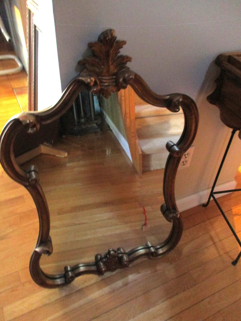 Miroir de style victorien. Sculptures au haut et au bas. 24 X 35 PO DE HAUTEUR