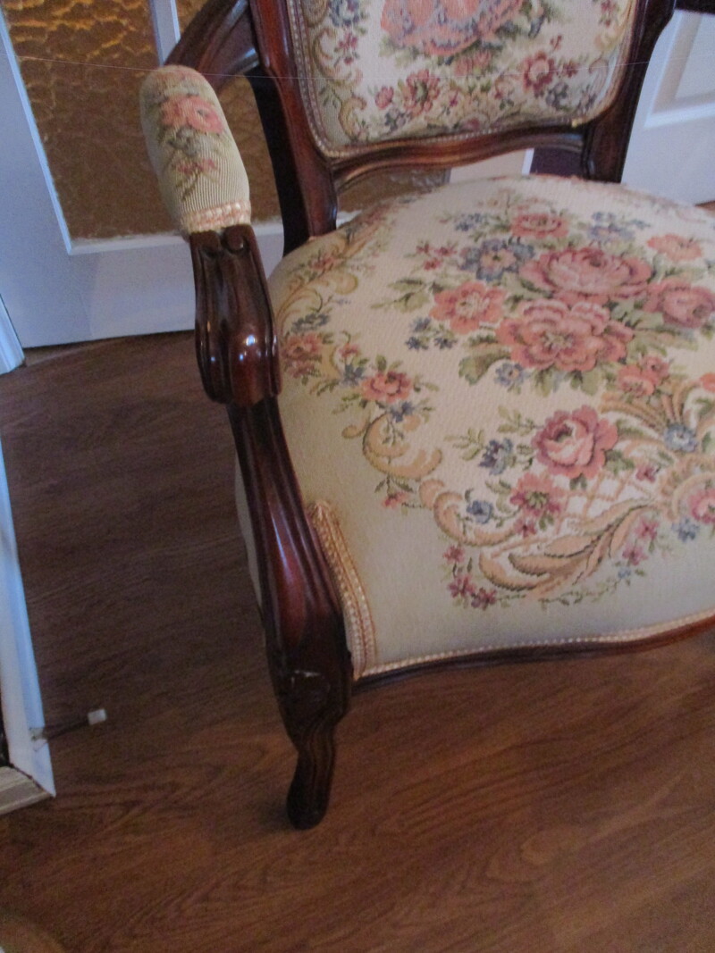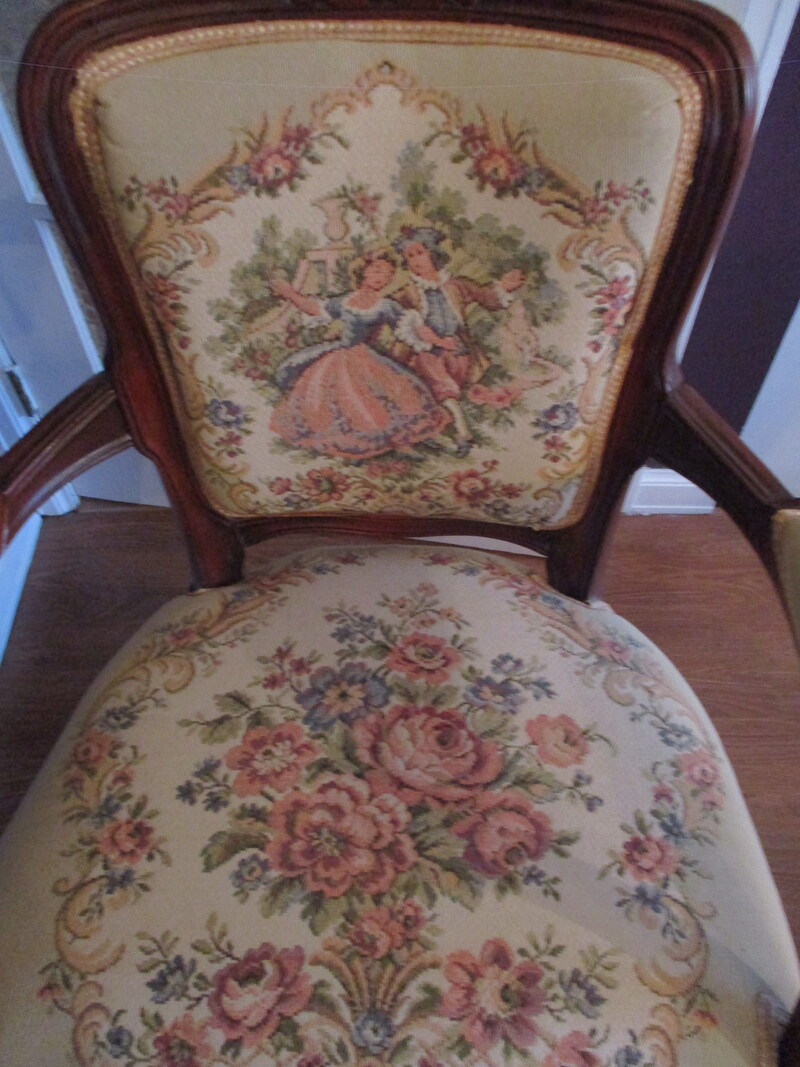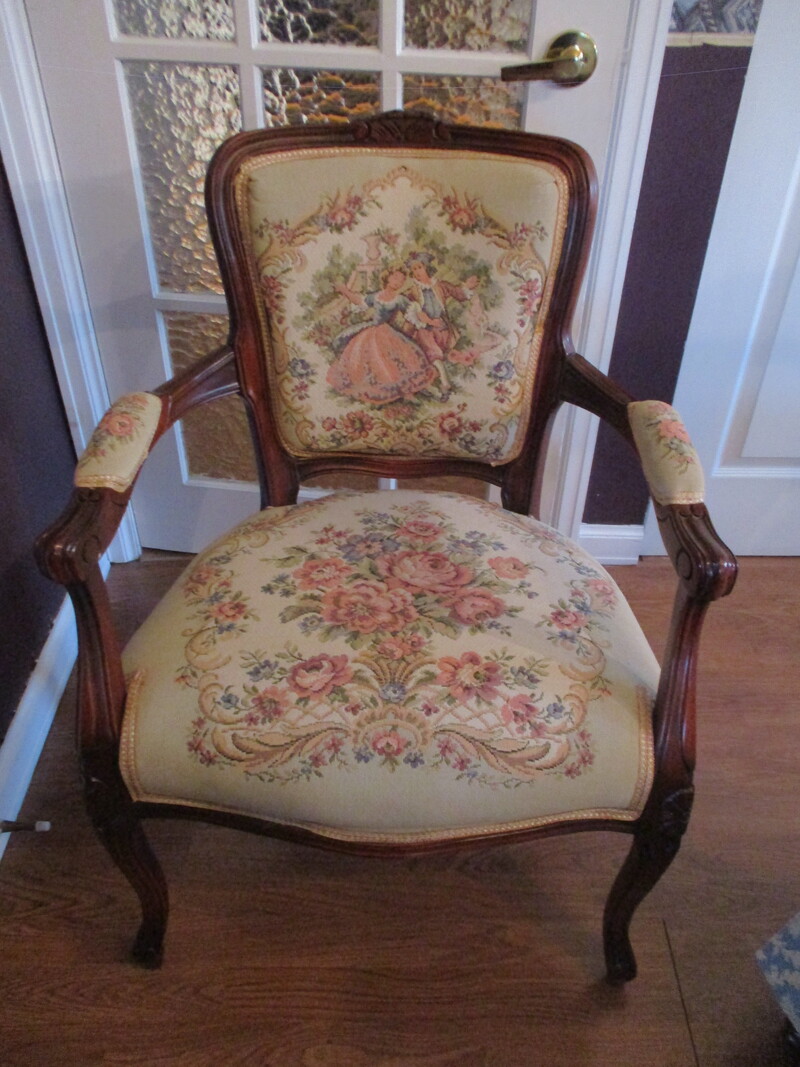 Très beau fauteuil de style Louis XV avec dossier, siège, et appui-bras en tapisserie. Parfait état.