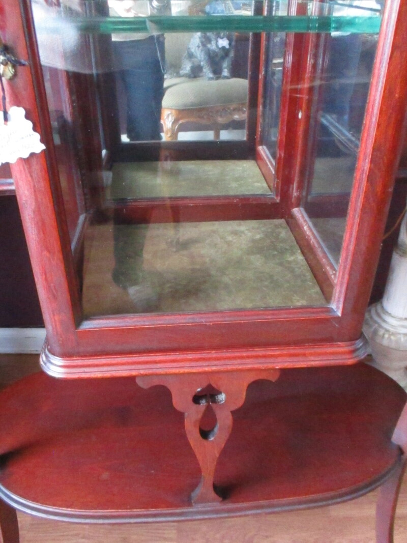 Étagère de style art nouveau en acajou des années 20.  Miroir biseauté, 4 tablettes, porte vitrée centrale avec étagère en verre et miroir.  28  12 X 57 po de hauteur