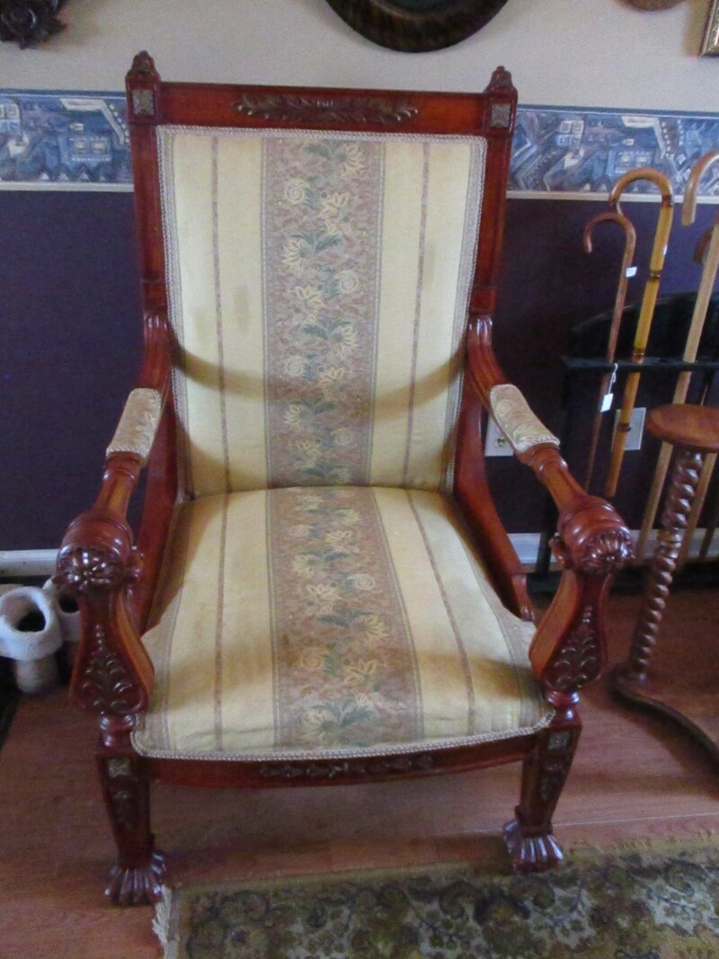 Fauteuil styleLouis XV EN ACAJOU. Sculptureau dossier, sur les côtés et èa l'avant. Pattes de lion a l'avant. Fin du X1Xe siècle