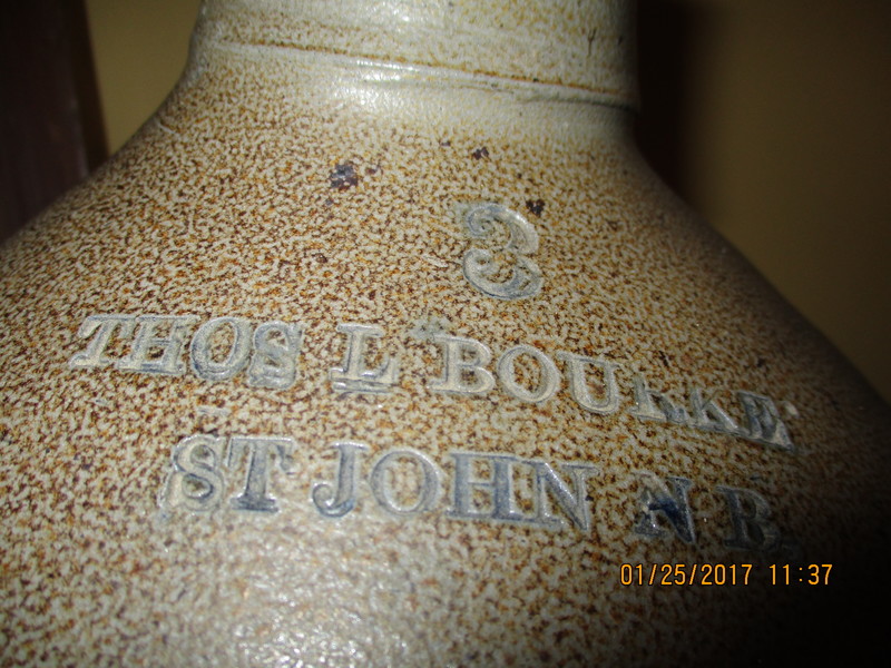Cruche 3 gallons en excellent état. Signé "Thos L Bourke" St-John N.B. En grais de couleur grise. 16" de hauteur