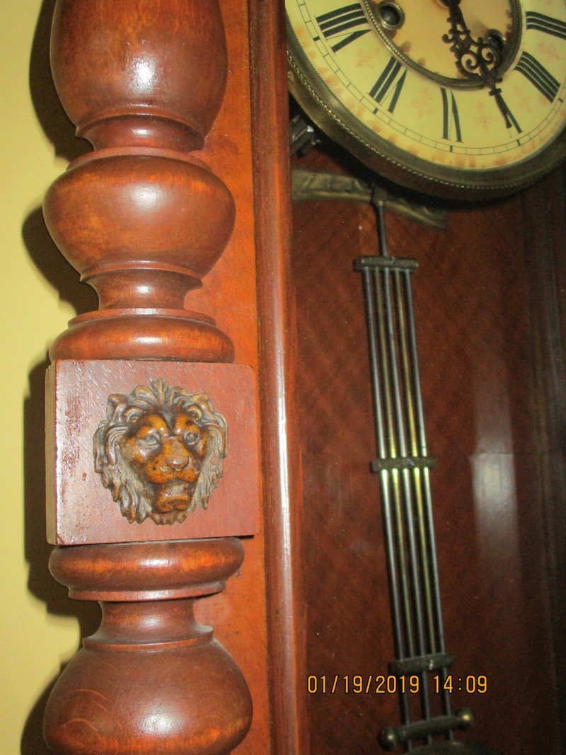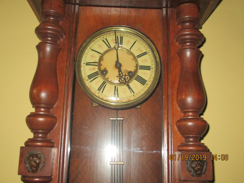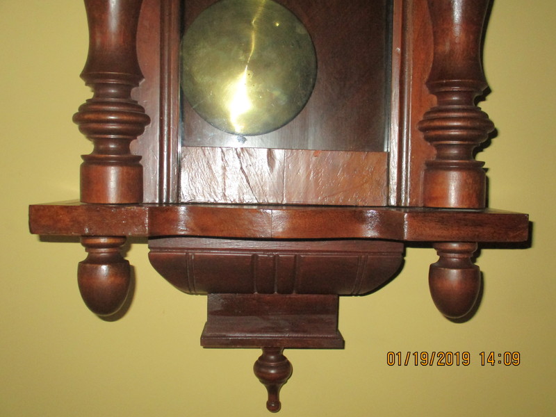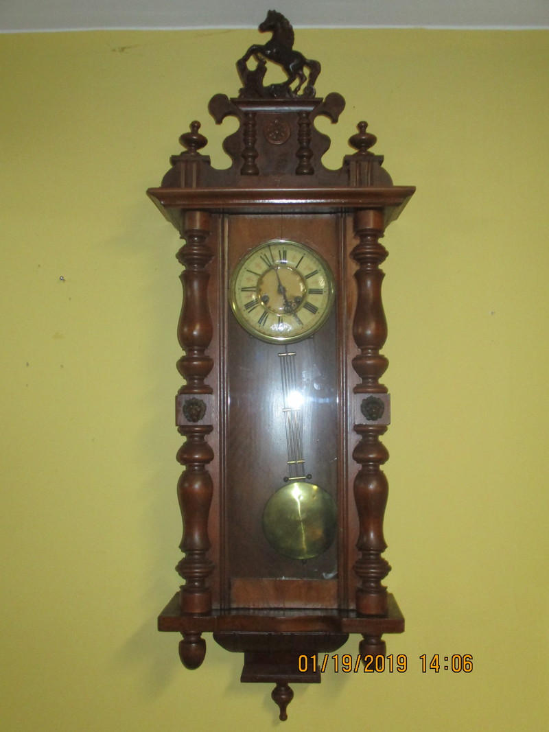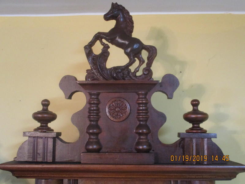 Horloge murale Forest noire Viennoise en noyer , vers 1900. Surplombée d'un cheval en bois. Sonnerie ½ heure et heure sur gong à ressorts, 8 jours